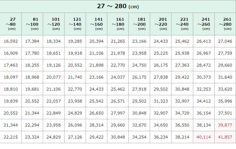 ※こちらの表に無いサイズは、製作外サイズになります。別途お問合せ下さい。