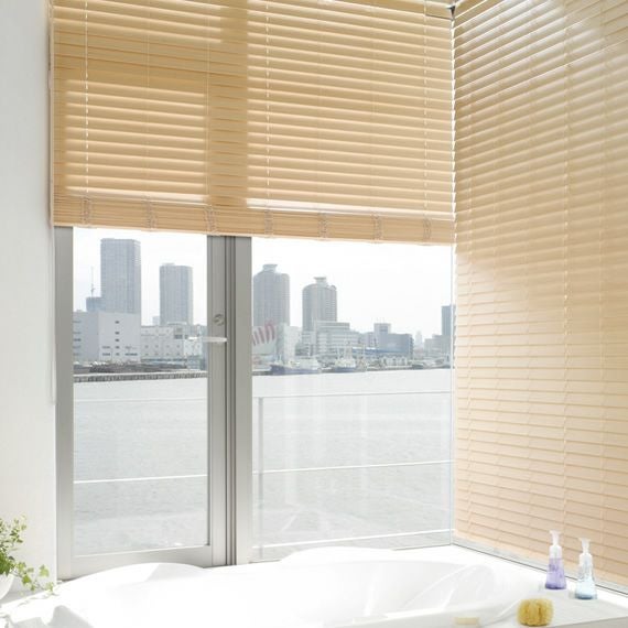 防炎に加えて耐水性を持たせた木調ブラインドはホテルのビューバス等におすすめです。もちろん一般住宅の浴室にも。ワンランク上の癒し空間を演出します。