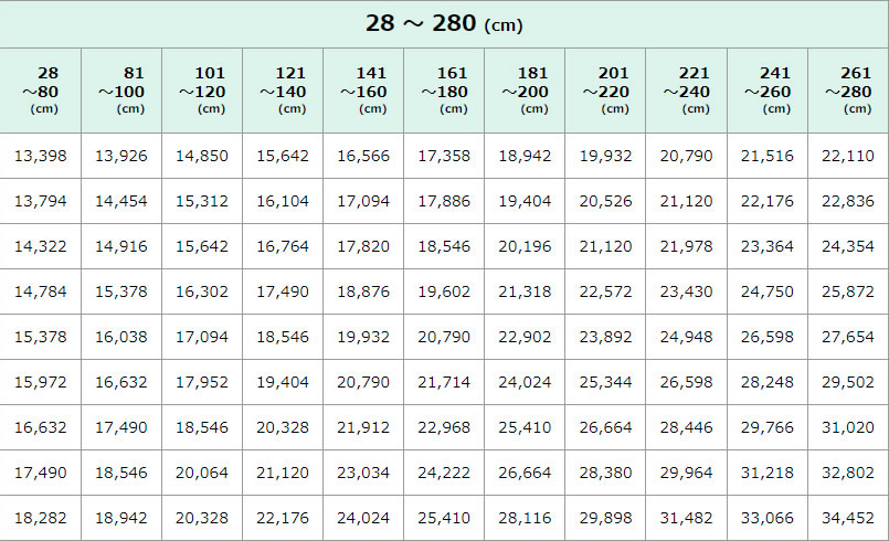 ※こちらの表に無いサイズは、製作外サイズになります。別途お問合せ下さい。