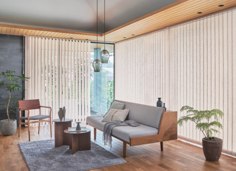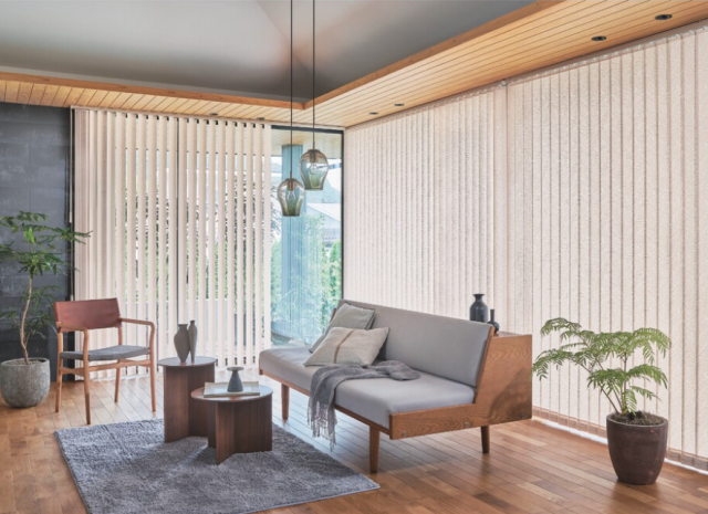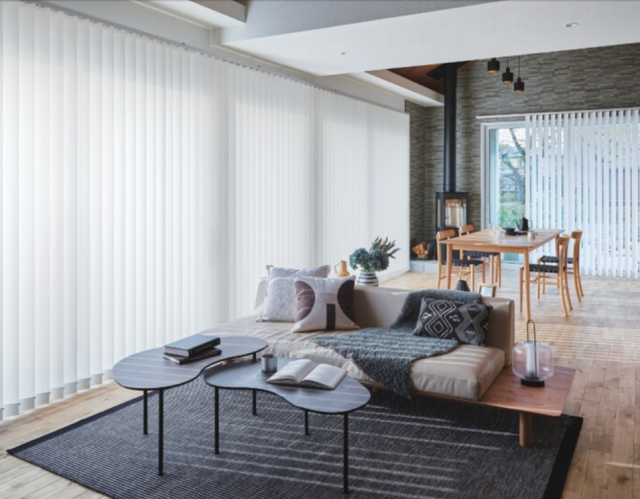 タチカワなら、タテ型ブラインド 「ラインドレープ ペア」が、レース付きのバーチカルブラインドになります。「昼はレース感覚でやわらかく、夜はしっかり」視線を遮れるのでおすすめです。