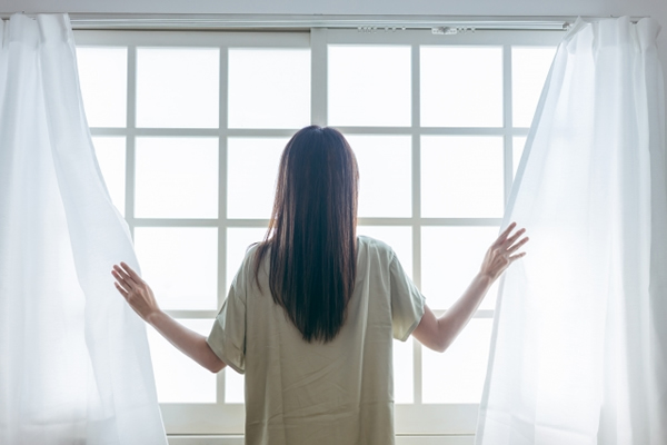 朝 カーテン 開ける女性
